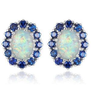 14K White Gold Plated Silver Tone Oval Post Back Stud Earrings Embellished with 8mmx 6mm Oval Cut 100% Genuine White Fire Opals and 2mm Round Cut Blue Sapphire
