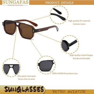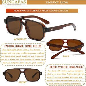 Features: Classic 70s vintage aviator design with a trendy square frame and bold, colorful lenses. Super lightweight plastic frame feels comfortable for all-day wear. UV400 protection keeps your eyes safe from strong sunlight. Perfect for dressing up your street style, partying, traveling, or everyday errands.
