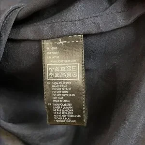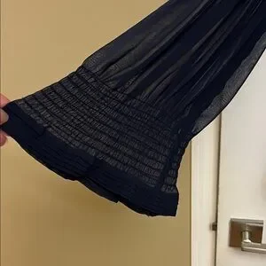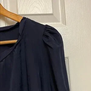 Chic navy blouse featuring smocked sleeves. Lightweight and versatile. Ideal for casual or dressy looks. Very elegant blouse in an excellent condition Size L. Half a sleeve is see through which adds even more elegance.