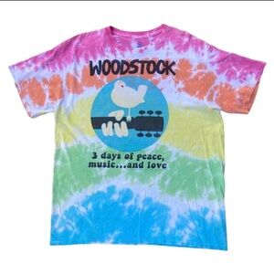 Peace, love, and vintage vibes. This officially licensed Liquid Blue Woodstock tee celebrates the legendary 1969 festival with the iconic dove-on-guitar graphic and “3 days of peace, music…and love” slogan. Featuring a classic rainbow spiral tie-dye pattern, soft 100% cotton fabric, and relaxed unisex fit.