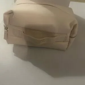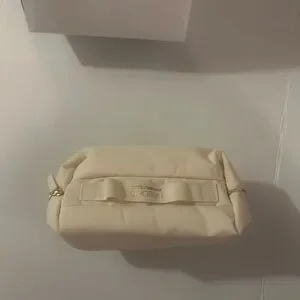 Chic and elegant cosmetic case. Features a sleek cream design. Perfect for organizing make up and perfume essentials.