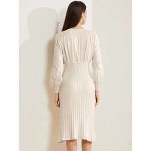 Women's Ribbed Knit Midi Dress Crew Neck Pleated Bishop Sleeve Casual