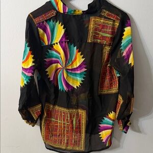 Add a splash of color to your wardrobe with this black blouse featuring a vibrant multicolor design. Perfect for any occasion.