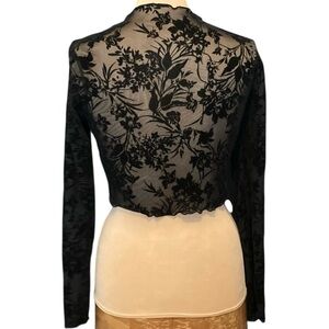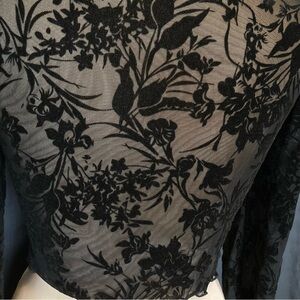Elegant black floral lace top with long sleeves. Perfect for a chic look. There is no size tag, but based on the measurements, I guessed Small.