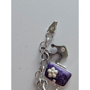 Adorable sterling silver round rolo link charm bracelet has a butterfly with a purple cz, a penquin, a purse that opens, a pink elephant, a cupcake charm and more! Marked 925 Italy SU. Measures approximately 7 inches long.