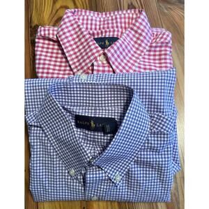 This product is a set of two Ralph Lauren men's long sleeve button-down shirts in sizes medium. One shirt is pink and the other is purple, both made from 100% cotton fabric. These shirts feature a collared neckline, button closure, and are suitable for various occasions including travel, parties, casual wear, work, and business meetings. The shirts are easy to care for, lightweight, and suitable for all seasons, making them a versatile addition to any man's wardrobe.