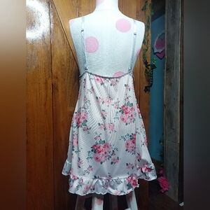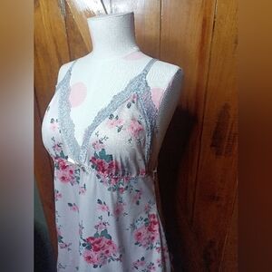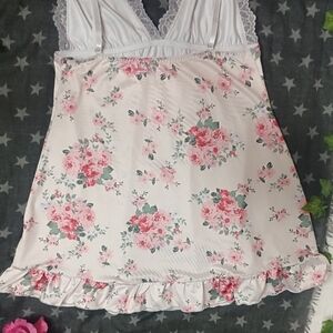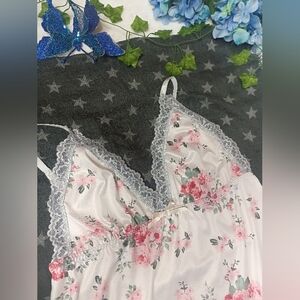 New Elegant floral nightgown with lace trim, perfect for a comfortable night's sleep. Features a beautiful blend of light pink floral detailing & Lacey around the bust with a bow in the center & has adjustable straps as well! has elastic going around the entire back to keep in place & on the bottom going around has a frilly look!