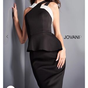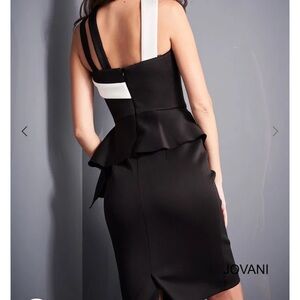 Stylish one shoulder dress by Jovani. Features a black and white design with peplum detail. Perfect for elegant occasions.