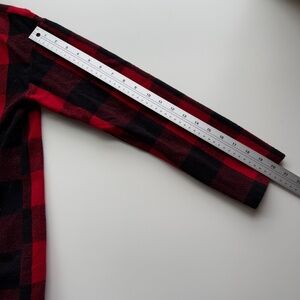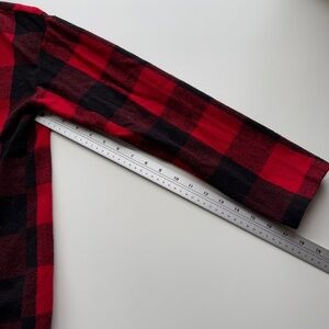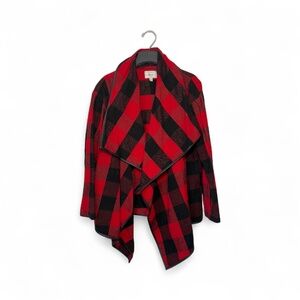 Description: This GH Bass flannel sweater jacket features a bold red and black buffalo plaid pattern with a soft, cozy texture. Designed with an open waterfall front and faux leather trim along the edges, it blends rustic charm with modern style. The relaxed fit and draped silhouette make it a versatile layering piece—perfect for adding warmth and statement flair to casual or outdoor looks.