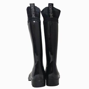 Classic Roberto Cavalli rain boots in glossy black. This pair is trimmed with in black with Roberto Cavalli signature logo in gold detail and embossed with the house moniker at the front.