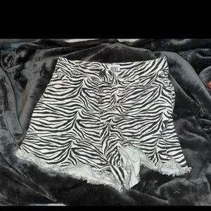 Chic zebra pattern shorts. Bold black and white design. Frayed hem for a trendy look.