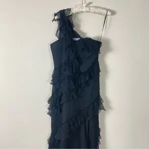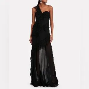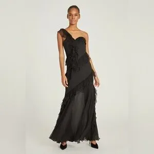 Elegant black maxi dress. Features one-shoulder design. Delicate ruffle details. Perfect for evening wear.