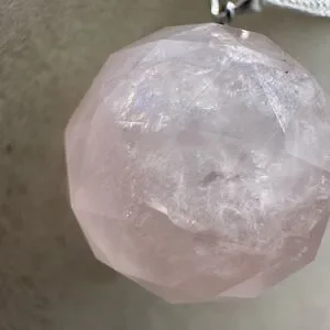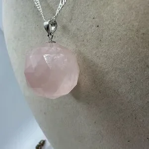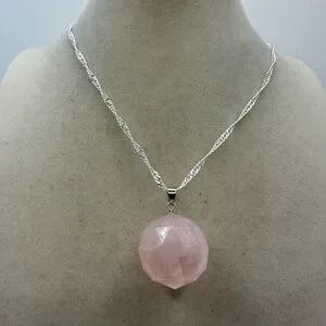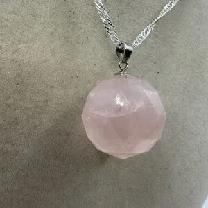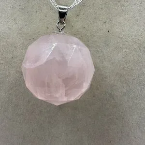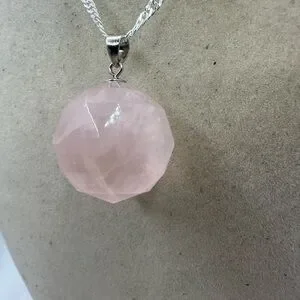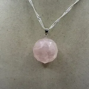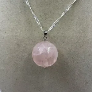 Faceted rose quartz pendant in a 3d disco ball shape. It’s about 3/4” tall and wide/all around. It’s on a silver 925 bail and 18”