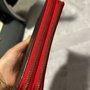 Elegant Coach wallet in rich brown leather with striking red accents. Perfect for everyday use.