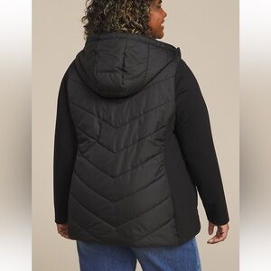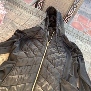 Maurice’s Quilted Hooded Jacket. Quilted front panel that provides insulation and warmth, stretch fabric sleeves and side panels, with full zipper closure. Functional side pockets, hooded, and elastic hem. In great preowned condition.
