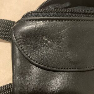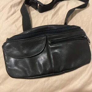 Sleek black belt bag by Mundi. Features dual zippered compartments. Perfect for on-the-go style.