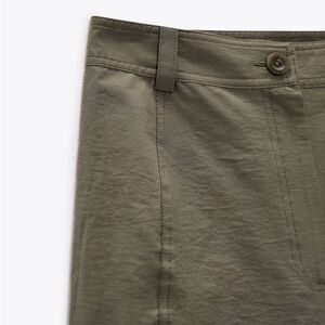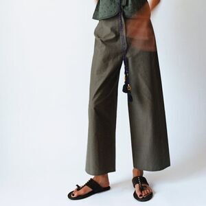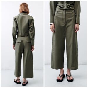 High waist pants made of cotton blend fabric. Belt loops. Pronounced tonal topstitching detail. Wide leg. Front zip and button closure.