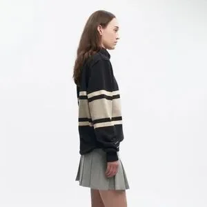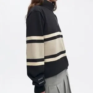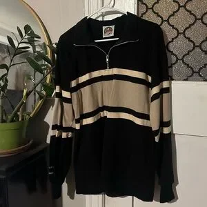 Elegant quarter zip-up sweater with bold stripes. Ideal for layering and style.
