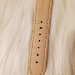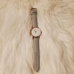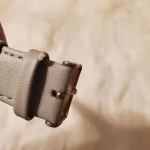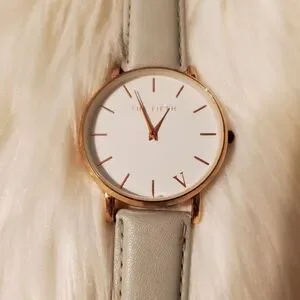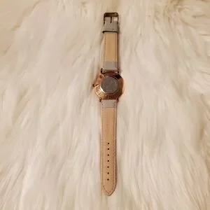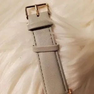 Stylish watch with a gray strap and gold accents. Features a white face with gold markers.