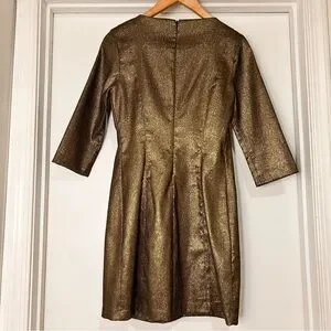Elevate your wardrobe with this stunning gold metallic sheath dress. Designed with a shimmering, textured finish that catches the light beautifully, this piece offers a sophisticated silhouette with three-quarter sleeves and a classic round neckline. Eye-catching, elegant, and effortlessly glamorous — a standout statement dress for any special occasion.