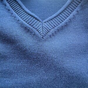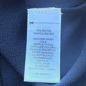 Elevate casual wear with this soft navy sweater featuring a flattering V-neck, ribbed elbow-length sleeves, and a smooth rayon blend texture for all-season comfort.