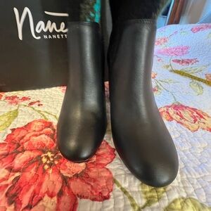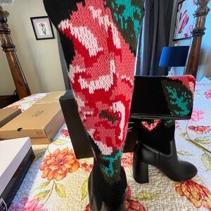 Stylish black boots with vibrant floral knit design. Features red and green patterns.