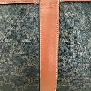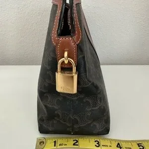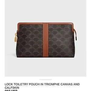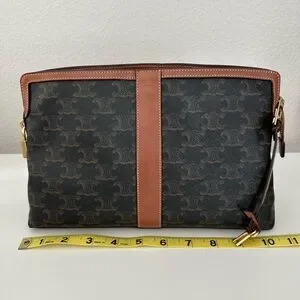 Elegant toiletry bag in dark brown and tan. Features signature Celine design. Ideal for stylish organization.