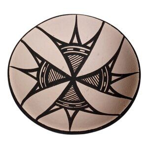 This intricately crafted Acoma pottery bowl, signed by Dean Reano, showcases a stunning off-white and black cross design. Created with traditional Navajo artistry, this piece embodies cultural heritage and timeless craftsmanship, making it a collectible treasure. Its compact size and unique pattern make it a wonderful decorative accent.