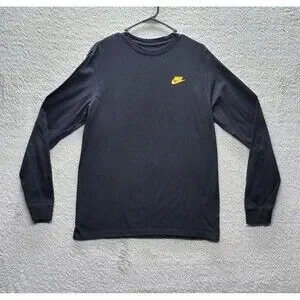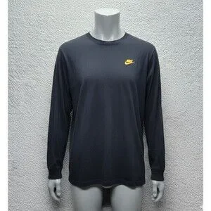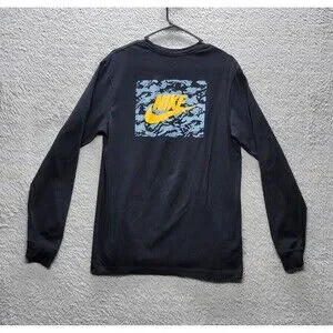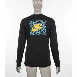 Men's M Nike The Nike Tee Black L/S T-Shirt Yellow Swoosh Blue Camo Back Graphi