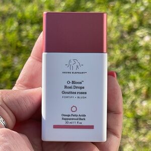 Shake before use. Dab a tiny bit onto cheeks or anywhere you would like to add a warm, natural-looking flush of color and barrier-fortifying omega fatty acids. Drunk Elephant O-Bloos Rosi Drops in pink packaging. Perfect for a radiant glow. Made in USA