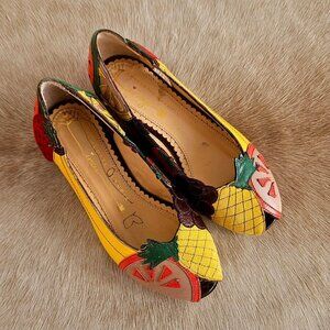 These gorgeous, one-of-a-kind fruit-themed ballet flats are a true showstopper! Featuring a vibrant, hand-crafted leather design with intricate appliqués of strawberries, pineapples, watermelons, grapes, and citrus slices, these shoes are bursting with color and personality. Bold, fun, and full of character – guaranteed to turn heads and collect endless compliments!