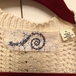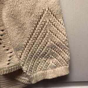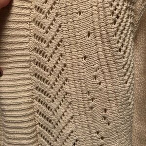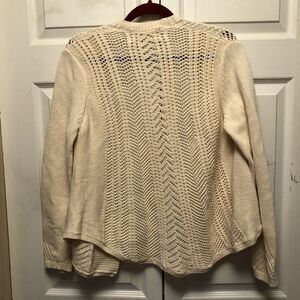 This cardigan is preowned but in great condition. It is an open weave cardigan and is an off-shite color.