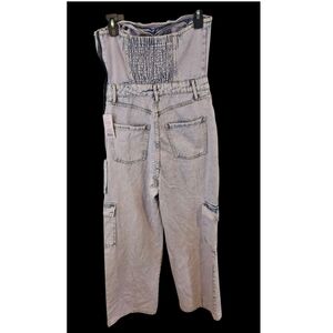 Women's size one-piece denim jumpsuit by Wild Fable. Made of washable 100% cotton in faded light wash denim with a hint of pink. Upper bodice is bare shoulder corset-like in front and has a rubber strip on the inside edge to keep it in place. Back is smocked with elastic for a great fit. Bottom is cargo pocmet style jeans with flap pockets on the legs. Pant legs are wide. Side zip. New with tag. Bottom of pants may have some dirt on them from shelf wear, but should come out with a good washing.