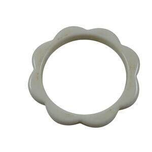 This is a charming vintage set of two unmarked bangle bracelets, likely dating from the 1960s or 1970s. One bracelet is a classic bold yellow with white stripes, while the other features a distinctive scalloped, solid off-white design. The material is a plastic-like substance, most likely Lucite, which was a popular choice for costume jewelry during the mid-20th century due to its vibrant colors and versatility. The bracelets are in good vintage condition, with light surface scratches and signs of wear consistent with their age, and would benefit from cleaning. This pair is perfect for stacking and would be a great addition to a collection of retro, mod, or mid-century modern jewelry.