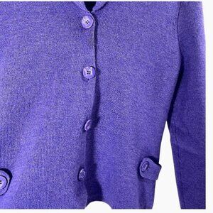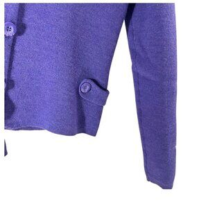 This is a great, expensive sweater in pre-owned condition with some signs of wear but overall, very nice condition! There are a few very tiny holes that have been repaired and are undetectable in my opinion but did want to disclose. There is a small stain below one of the buttons that will probably come out. See all photos for best description. Crafted from high-quality 100% merino wool, known for its softness and durability.The soft, breathable fabric ensures comfort while maintaining a chic look. The vibrant purple shade adds a pop of color to any outfit! Side button tabs add extra interest and character to this classy and elegant cardigan.