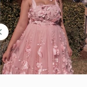 Elegant pink dress with floral appliqués. Ideal for formal events.