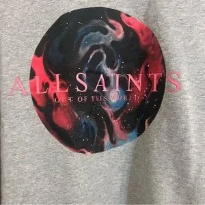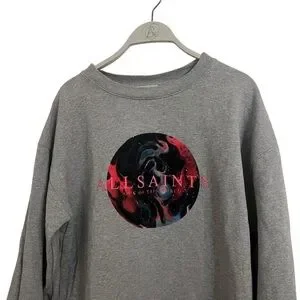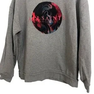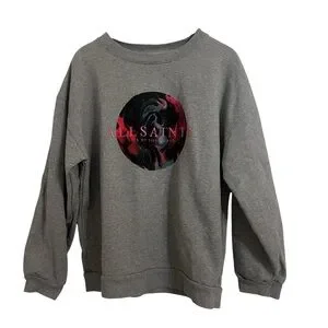Cozy All Saints sweatshirt in gray. Features a bold artistic logo on the front. Ideal for casual wear.