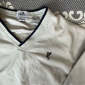 Classic vintage Ashworth pullover in a light beige tone with navy trim. Features a V-neck design, elastic cuffs and hem, adjustable bungee drawcord, and embroidered golfer logo. Water-resistant and wind-resistant—perfect for transitional weather or a day on the golf course.