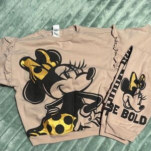 Charming Disney sweatshirt featuring Minnie Mouse. Tan with bold gold accents. Perfect for young Minnie fans. Slight staining as shown
