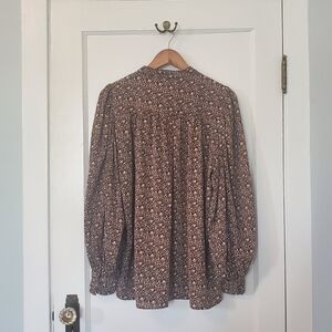 Add a touch of old-world romance to your fall wardrobe with this gorgeous blouse. It features a Mandarin collar at the top, and a series of tiny fabric-covered buttons held in place by elastic loops down the front. It’s gathered above the bust and along the back, and it has full bishop sleeves with cuffs. You’ll feel beautiful wearing this blouse!