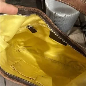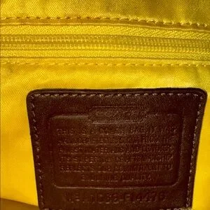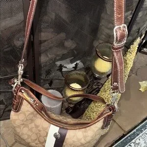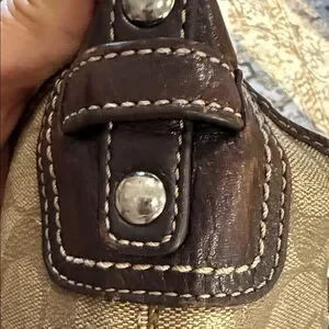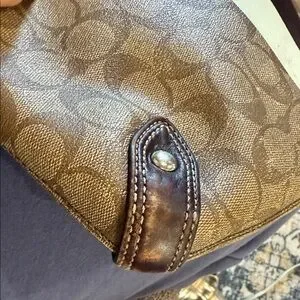 Stylish Coach shoulder bag with signature pattern. Features brown and cream stripe detail. Perfect for everyday use.