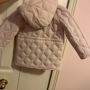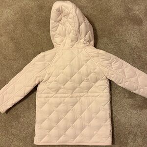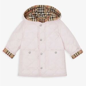 Stylish pink quilted puffer jacket. Features classic Burberry check lining. Hooded design with front pockets.