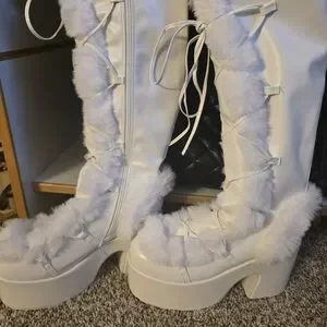 Step up your style with these chic white faux fur lace-up heeled boots. Perfect for adding a touch of elegance to your winter outfits.