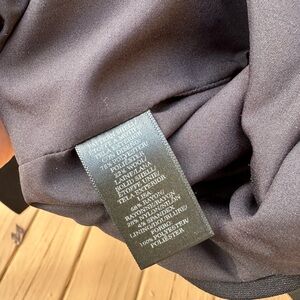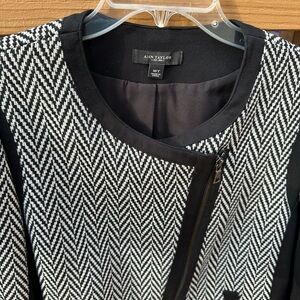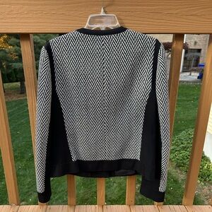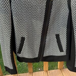 This black and white jacket is all about the details: the woven chevron pattern, asymmetrical moto zip style, and the black paneling. Looks sharp both zip closed and open over a shell. Size 16 Tall, meaning it has some additional length.