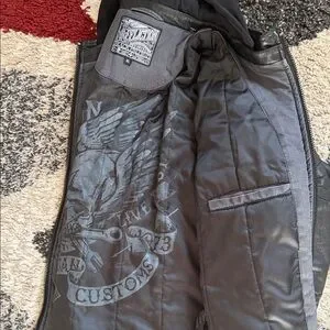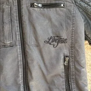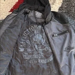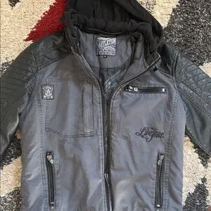 Charcoal jacket with black accents. Features zipper pockets and quilted leather sleeves. Bold and edgy style.NWOT