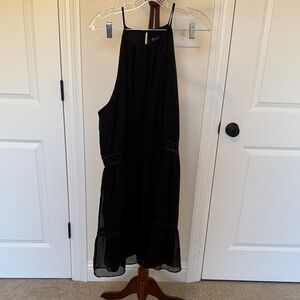 Chic black mini dress with halter neckline. Flowy skirt and elegant design. Perfect for any event.
