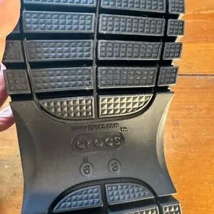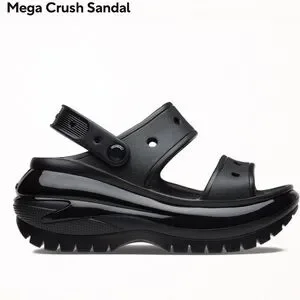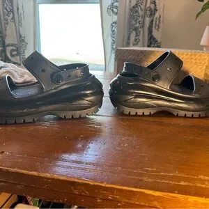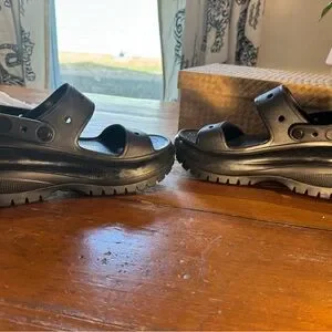 Crocs Mega Crush Sandal in black. Size 8 but fits SMALL. More like 7.5. Scuffing from 2x wear. The rubber scuffs easily. Fun shoe.