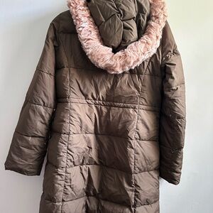 Stylish brown puffer coat with a cozy faux fur hood. Perfect for cold weather.
