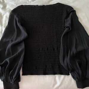 Beautiful & perfect for holiday season! Giorgio Armani Collezioni Black Smocked Top Blouse with Sheer Balloon Sleeves and elastic cuffs size 40 small. Pull-over, boat neckline, elasticized bodice. Made in Italy