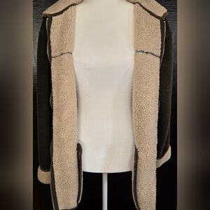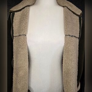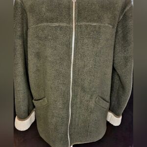 This is gently worn and is in excellent condition! This vintage dark green coat features a cream fleece interior lining with a full zip closure and a sherpa-lined hood/collar. It also has 2 front pockets and the bottom of the sleeves are cuffed with the fleece showing. This coat is extremely comfortable and warm. 100% Polyester and is Dry Clean Only. "Color does vary in some of the pictures, but the coat is a dark olive green." Approximate measurements are 22" across the chest and 28" long